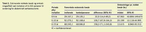 Tabel 2 viser estimatet bag antal reddede leveår og omkostningerne pr. reddet leveår. Hovedforudsætningerne var konservative; at ikke-AAA-mortaliteten er upåvirket af screening, og at screening kun har effekt 1,5-5 år efter invitationen med en AAA-mortalitetsratedifference på 0,89 pr. 1.000 år (95% KI: 0,40-1,37), som observeret i dette studie. Efter fem år antages AAA-mortaliteten igen at være upåvirket af screening.