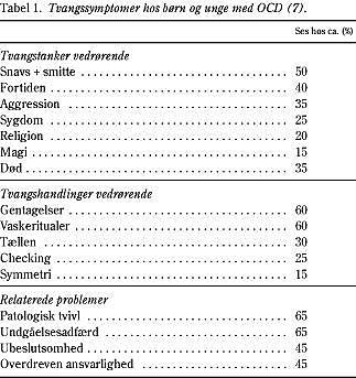 Obsessiv-kompulsiv tilstand er nu fuldt anerkendt som en hyppig og ofte invaliderende tilstand hos børn. Befolkningsundersøgelser fra flere forskellige lande med forskellig kulturel baggrund viser en ensartet hyppighed i forekomsten af OCD hos børn og unge på mellem 1% og 1,5% (5, 6). Befolkningsundersøgelser af børn og unge viser endvidere, at mange personer med OCD ikke kommer til behandling. Symptomerne er de samme som ses hos voksne, selv om flere studier har antydet, at tvangshandlinger er mere udtalte hos børn, samt at børn er mere tilbøjelige end voksne til at involvere deres familie i ritualerne. De fleste børn og unge med OCD har flere forskellige tvangssymptomer på en gang. De mest almindelige symptomer er angst for snavs og smitte med deraf følgende vaskeritualer, angst for at noget frygteligt skal tilstøde barnet/den unge selv eller en nærtstående, tvangstanker om symmetri eller forskellige, mangeartede ritualer i form af gentagelseshandlinger, kontrolritualer, tælle- eller røreritualer (Tabel 1 ).