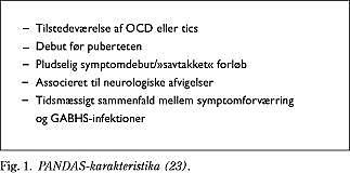 De første tilfælde med PANDAS-associerede OCD-symptomer blev beskrevet af Swedo et al i 1998 (24). Børnenes tvangssymptomer debuterede akut, ofte med et dramatisk udtryk, og udløst af infektioner med streptokokker. Det kliniske forløb var karakteriseret af et savtakket forløb med recidiv og remissioner. I kølvandet på recidivperioderne var børnene tydeligvis mere emotionelt labile, præget af separationsangst, koncentrationsvanskeligheder, oppositionel adfærd, motorisk hyperaktivitet, impulsivitet og let-afledelighed (som hos mange faktisk opfylder kriterierne for hyperkinetisk forstyrrelse). Man fandt alle typer af OCD-symptomer, og som i andre grupper af OCD-patienter var angst for snavs og smitte og vaskeritualer blandt de hyppigst beskrevne symptomer. En undersøgelse antyder, at både febris rheumatica og Sydenhams chorea er forbundet med en øget risiko for udvikling af OCD-symptomer (25). Undersøgelser af voksne OCD-patienter antyder, at OCD-symptomer og tics muligvis er korreleret til febris rheumatica og Sydenhams chorea, og at OCD-symptomer og tics kan persistere, efter at symptomerne på febris rheumatica og Sydenhams chorea er forsvundet, hvilket antyder, at faktorer ikke umiddelbart relateret til det akutte, abnorme immunrespons kan være af betydning. Moshed et al undersøgte immunrespons (IgG-, IgM- og IgA-antistoffer), således at den totale koncentration af antistoffer samt tilstedeværelse af antistoffer rettet mod basalganglierne blev målt (26). Man fandt, at børn og unge med Tourettes syndrom havde en signifikant øget serumkoncentration af disse antistoffer sammenlignet med kontrolpersoner. På trods af dette fund kunne man dog ikke konkludere nogen sikker association mellem det kliniske udtryk og de fundne markører for streptokokinfektion. Præliminære fund har foreslået en B-cellemarkør (D8/17) som betydningsfuld hos børn med febris rheumatica, Sydenhams chorea og PANDAS. Specificiteten af dette fund er dog fortsat uafklaret.