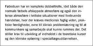 Fødestuen har en kompleks dobbeltrolle, idet både den normale fødsels afslappede atmosfære og også kritiske situationer med livstruende hændelser, som kræver medicinsk faglig viden, praktiske færdigheder, evne til klinisk problemløsning, kommunikation og samarbejde, skal kunne rummes der. De ovenfor nævnte kompetencer er blandt dem, der nu er basis i alle speciallægeuddannelser i Danmark.