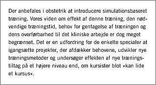 Simulationsbaseret træning er introduceret i flere specialer, især anæstesi og kirurgi, og anbefales i de nævnte britiske publikationer også for obstetrikere. Set fra en pædagogisk vinkel virker den deltageraktiverende træning rationel. Læreren fungerer som facilitator af læring i højere grad end egentlig underviser, og kursusdeltagerne kan følge egen fremgang. Vores viden om effekt af denne træning, den nødvendige træningstid, behov for gentagelse af træningen og dens overførbarhed til det kliniske arbejde er dog meget begrænset.