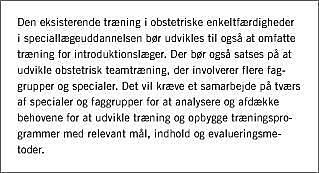 I Danmark er der nu igangsat systematisk træning i obstetriske enkeltfærdigheder for kursister i speciallægeuddannelsen [1], og det bør videreudvikles til også at omfatte træning i enkeltfærdigheder for introduktionslæger. Træning af vagtbærende speciallæger i håndtering af obstetriske hændelser, der er så sjældne, at det er umuligt at bevare erfaring via klinisk arbejde bør også overvejes. Disse initiativer skal formentlig udvikles regionalt, men vil med fordel kunne understøttes af et nationalt program, der sikrer mål, indhold og evaluering af træningsinitiativerne. I denne sammenhæng vil det være relevant at udvikle kurser for undervisere, så både den faglige og pædagogiske kvalitet kan sikres.