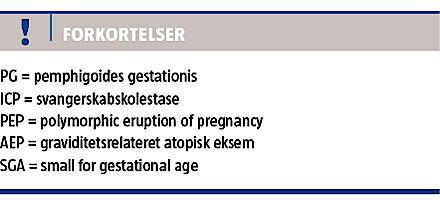 De graviditetsbetingede dermatoser er en gruppe af hudsygdomme, som ses under graviditeten samt i de første seks uger post partum. De kan inddeles i pemphigoides gestationis (PG), svangerskabskolestase (ICP), polymorphic eruption of pregnancy (PEP) tidligere kaldet pruritic urticarial papules and plaques of pregnancy (PUPPP) og graviditetsrelateret atopisk eksem (AEP) efter klassifikationen fra 2006 [1-5]. De er karakteriseret af udtalt kløe og er vigtige at kende til, da nogle øger risikoen for præterm fødsel, fetal distress og intrauterin fosterdød [1, 6, 7]. Klinisk kan tilstandene være vanskelige at adskille. Udredningen af dermatoserne kan foregå i almen praksis eller i dermatologisk og/eller obstetrisk regi, mens en eventuel behandling som udgangspunkt foregår i et samarbejde mellem en obstetrisk og en dermatologisk