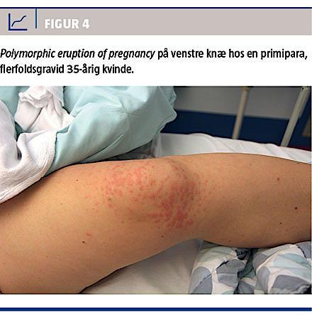 PEP er hyppigere hos primipara, flerfoldsgravide og i tilfælde af excessiv vægtstigning i graviditeten [1-3, 5-7, 10]. Patienterne har intens kløe, og der ses et papulourtikarielt udslæt, som ofte begynder på abdomen i relation til striae distensae (dog uden om umbilicus) og efterfølgende konfluerer til plaques (Tabel 1). Udslættet spreder sig hyppigt til truncus og ekstremiteterne (Figur 3 og Figur 4). Senere bliver forandringerne polymorfe, og der kan ses vesikler samt små bullae. Ansigtet og slimhinderne er sjældent angrebet.