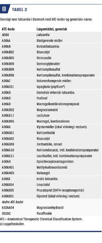 mekanisme på tarmen og tarmindholdet. Udvalget af præparater i Danmark er mangfoldigt med mange salgsnavne, som kan minde meget om hinanden, trods forskellige virkningsmekanismer. I Tabel 2 gives et overblik over »laksantiajunglen« i Danmark.