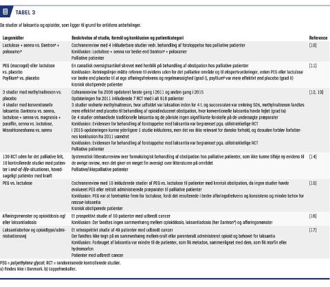 Der er publiceret flere oversigtsartikler og systematiske review om farmakologisk behandling af obstipation hos palliative patienter. I dem alle konkluderes det, at velgennemførte studier målrettet denne patientgruppe er meget få. I Tabel 3 vises i oversigt de publikationer, der er anvendt i det følgende.