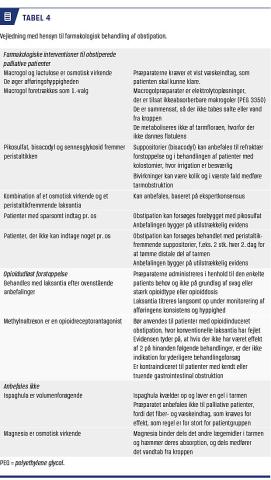 effekt af laksantia og obstipation baseret på de to identificerede studier med palliative patienter [16, 17]. Anbefalinger, som knytter sig til farmakologisk behandling af obstipation hos palliative patienter, er samlet i Tabel 4, hvortil der er knyttet enkelte kommentarer for anvendelsen. Anbefalingerne i tabellen skal ses i lyset af, at det understreges i flere af de omtalte referencer, at ekstrapolation af resultater fra studier med andre patientpopulationer end palliative patienter skal ske med forsigtighed. Især terminale patienter kan have en øget risiko for bivirkninger, herunder gastrointestinal perforation.