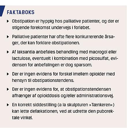 Den internationale litteratur kan være svær at overskue, og ofte omtales laksantia, der ikke er registreret i Danmark. Formålet med artiklen er at give en oversigt over evidensen for obstipationsbehandling af palliative patienter målrettet danske forhold og på den baggrund komme med anbefalinger til den praktiske behand-