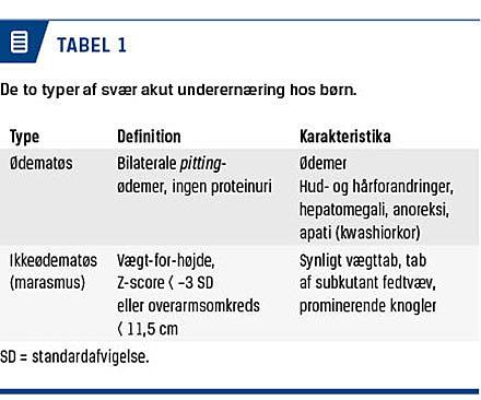underernæring (Tabel 1). Tilstanden kaldes kwashiorkor, hvis ødemerne ledsages af forstørret lever, hudaffektion, anoreksi og psykiske ændringer. Det er en akut livstruende tilstand, som ofte er udløst af infektioner og forbundet med høj mortalitet. Patogenesen er ukendt [2]. Ødematøs underernæring forekommer sjældent i industrialiserede lande, men er beskrevet hos børn med kroniske sygdomme [3] og ved fejlernæring bl.a. pga. restriktive diæter, der er etableret af ikkeernæringskyndige pga. mistanke om visse sygdomme, især diæter baseret på plantebaserede »mælke«-drikke som f.eks. rismælk. I udviklingslande ses tilstanden relativt hyppigt og er associeret med fattigdom, pludseligt ophør af amning samt mangelfuld kost uden animalske produkter. Børn med ødematøs underernæring behøver ernæringsterapi samt antibiotika mod klinisk stumme infektioner og bakteriel overvækst i tyndtarmen. Pga. væske- og natriumretention samt nedsat hjertefunktion tåles intravenøs rehydrering dårligt, og natriumtilskud bør undgås trods hyponatriæmi.