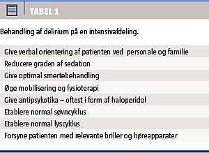 Såfremt man ved neuroradiologiske undersøgelser tidligt kan identificere patienter, der er i risiko for at udvikle intensivt delirium, bør der være mulighed for tidlig intervention. Imidlertid er behandlingsmulighederne ved intensivt delirium ud over behandling af den tilgrundliggende lidelse fortsat begrænsede [2] (Tabel 1).
