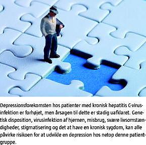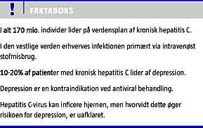 På verdensplan er ca. 170 millioner individer smittede med hepatitis C-virus (HCV). Mindst 15.000 danskere vurderes at være smittede, og prævalensen af kronisk HCV-infektion forventes i den vestlige verden at stige i fremtiden. Den antivirale behandling af HCV, der består af en kombination af interferon og ribavirin, er forbundet med adskillige bivirkninger, især neuropsykiatriske og neurovegetative, i form af depression, træthed og søvnproblemer. Netop depression er den hyppigste årsag til dosisreduktion og behandlingssvigt, og anden alvorlig psykopatologi (f.eks. udvikling af mani eller psykose) er også observeret - om end i væsentligt mindre omfang [1].