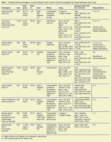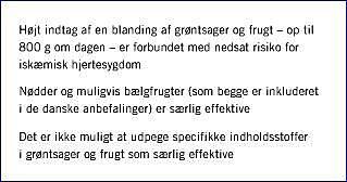 Evidensen for, at grøntsager og frugt nedsætter risikoen for IHD, bygger hovedsagligt på observationelle studier. I enkelte randomiserede interventionsstudier har man påvist, at specifik rådgivning om øget indtag af grøntsager og frugt kan forbedre risikomarkører for IHD, f.eks. forbedre lipidprofilen og nedsætte blodtrykket [2, 3]. Der er kun publiceret et randomiseret studie, hvor effektmålet var IHD, men i dette studie lykkedes det kun at øge frugt- og grøntindtaget marginalt [4]. I to andre randomiserede undersøgelser har et øget frugt- og grøntindtag ikke været det primære mål for kostændringen, men er indgået som en del af en sund interventionskost, hvorfor de fundne reduktioner i IHD ikke i sig selv kan tilskrives et øget frugt- og grøntindtag [5, 6].