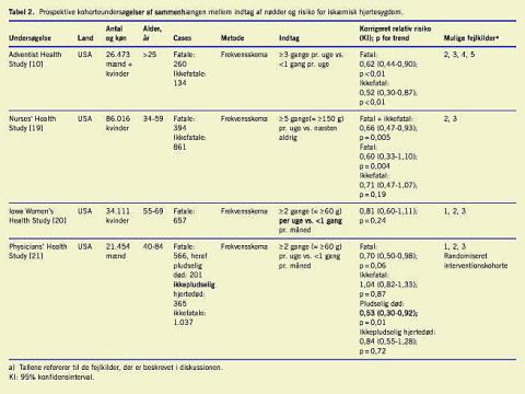 Resultater fra fire store amerikanske kohorter (Tabel 2 ) har vist, at hyppigt indtag af nødder er forbundet med nedsat risiko for IHD [11,19-21]. Risikoreduktionen har varieret mellem 20% og 40% i grupper med højt indtag (60-150 g pr. uge) sammenlignet med grupper, der stort set aldrig spiser nødder. I to af undersøgelserne er det primært risikoen for fatal IHD og pludselig hjertedød, der er nedsat. Der er i de fleste undersøgelser fundet dosis-respons-sammenhæng mellem indtag og risiko. I Nurses' Health Study [19] var højt indtag af jordnødder, som i USA udgør halvdelen af det samlede indtag af nødder, omvendt relateret til risiko for IHD (multivariat korrigeret relativ risiko (RR): 0,66; andre nødder: RR: 0,79). Nøddeindtaget i Danmark er lavt, i gennemsnit omkring 2 g pr. dag blandt voksne og kun omkring 10% spiser nødder ≥ 1 gang om ugen (i USA spiser 25% nødder mindst en gang om ugen).