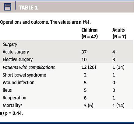 Alle patienter blev opereret for malrotationen. Der var flere komplikationer hos børnene, men der var ingen statistisk signifikant forskel i mortalitetsraten mellem de to grupper. Komplikationer forekom i begge aldersgrupper, men kun hos patienter, der var opereret akut. Komplikationer omfattede sårinfektion, ileus pga. adhærencer, korttarmssyndrom og død på grund af volvulus.