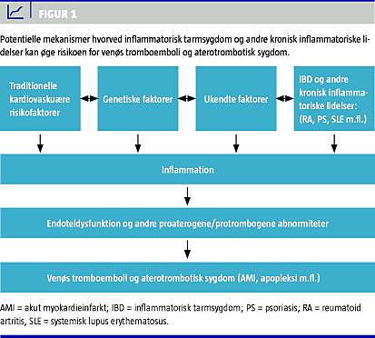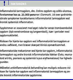 I et nyligt publiceret registerstudie, der omfatter alle danske patienter, der havde inflammatorisk tarmsygdom i perioden 1980-2005, påviste man en næsten fordobling af risikoen for VTE hos disse patienter sammenlignet med hos raske kontrolpersoner [21]. I et stort engelsk studie med knap 14.000 patienter med inflammatorisk tarmsygdom fra almen praksis og ca. 72.000 raske kontrolpersoner fandt man en 3,4 gange øget risiko for VTE, og ved opblussen af inflammatorisk tarmsygdom (defineret som en opblussen inden for en periode på fire måneder efter ordination af kortikosteroid) var VTE-risikoen 8,4 gange højere hos patienter med inflammatorisk tarmsygdom end hos kontrolpersoner [7]. I tråd hermed har man tidligere i amerikanske studier fundet øget risiko for VTE hos patienter med inflammatorisk tarmsygdom, herunder indlagte patienter, i forhold til andre indlagte patienter [22]. Tillige er femårsrisikoen for recidiv efter førstegangstilfælde af VTE højere hos patienter med inflammatorisk tarmsygdom end hos andre patienter [23]. VTE kan være livstruende, og i et mindre studie fandt man en mortalitetsrate på 22%, og i 80% af tilfældene indtraf VTE ved aktive stadier af inflammatorisk tarmsygdom, ligesom VTE-recidivraten på ca. 10% i øvrigt var uafhængig af, om patienterne fik foretaget total kolektomi eller ej [24].