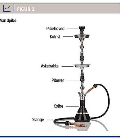En vandpibe består af en kulrist, et vandpibehoved til tobak, en askebakke, et piberør, en kolbe til vand og en eller flere slanger med mundstykke (Figur 1). Ved rygning anbringes der glødende kulstykker i kulristen. Tobakken i pibehovedet antændes herefter ved sugning på slangen. Ved hjælp af piberøret overføres røg fra pibehovedet ned igennem glaskolben og ud til mundstykket [3, 6].
