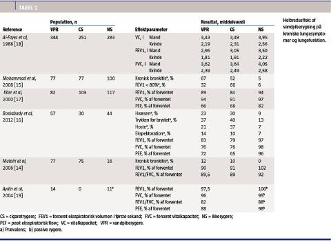 Vandpiberygning er forbundet med en række patofysiologiske effekter på luftvejene (Tabel 1). Ved hjælp af spørgeskemaundersøgelser er der fundet en større hyppighed af kronisk bronkitis i gruppen af vandpiberygere end hos cigaretrygere og ikkerygere (12% hos vandpiberygere, 10% hos cigaretrygere og 0% hos ikkerygere i ét studie samt henholdsvis 67%, 40% og 5% i et andet studie) [14, 15]. Forekomsten af respiratoriske symptomer som hvæsende vejrtrækning, trykken for brystet, hoste og ekspektoration var højest blandt cigaretrygere, men vandpiberygere havde en højere forekomst af disse symptomer end ikkerygere [16]. Resultater vedrørende effekter af vandpiberygning på lungefunktionen viser lavere FEV1 og FVC hos vandpiberygere end hos ikkerygere og personer, som i en længere periode har været passive cigaretrygere [16, 17, 19]. Mohammed et al [15] fandt, at forekomsten af FEV1 < 80% af forventet værdi var ca. fire gange højere blandt vandpiberygere end blandt ikkerygere – dog var forekomsten blandt vandpiberygere 50% lavere end hos cigaretrygere. Hvad angår selve værdien af FEV1 hos vandpiberygere sammenlignet med cigaretrygere fandt man i to studier lavere værdier hos cigaretrygere [16, 17], mens man i ét studie ikke fandt nogen forskel [14]. Endvidere har man i et enkelt studie, som omfattede 878 saudiarabiske rygere, fundet lavere værdier af vitalkapacitet, FEV1 og FVC hos vandpiberygere end hos cigaretrygere [18].