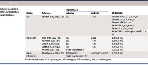 værdier af FEV1/FVC hos vandpiberygere end hos ikkerygere [14, 18] og personer, der har været udsat for passiv cigaretrygning [19]. I et nyere studie med 211 patienter med KOL i Beirut fandt man en høj risiko (oddsratio (OR) = 11,7) for, at der udvikledes KOL hos tidligere vandpiberygere (Tabel 2). Hos aktive vandpiberygere var denne sammenhæng dog mindre stærk (OR = 1,8). Den kumulative eksposition ( ≥