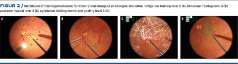 Ud over træningsprogrammet for kommende kataraktkirurger er der udviklet et delvist træningsprogram [6], som giver kommende VR-kirurger mulighed for at træne i visse validerede procedurer, før de initierer kirurgi hos rigtige patienter (Figur 2). Der er ud over dette også udført et dansk systematisk review om VR-kirurgi, hvor formålet var at evaluere den tilgængelige evidens for simulationstræning for nybegyndere i VR-kirurg [28]. Man fandt, at simulationstræning i VR-kirurgi var et brugbart evalueringsredskab, der kunne være med til at lære kirurgerne komplekse teknikker, som var påkrævet i VR-kirurgi. Man gjorde det dog klart, at yderligere forskning med mere ens studiedesign og valideringstermer var nødvendige for at styrke evidensen. Derudover konkluderedes det, at der mangler evidens for overføring af kompetencer fra simulationstræningen til operationsrummet.