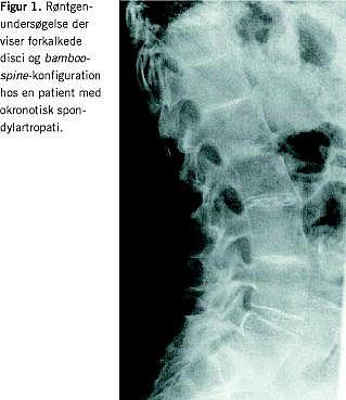 En 53-årig kvinde blev på mistanke om AS henvist til reumatologisk ambulatorium. Problemet var tiltagende smerter og stivhed i ryggen samt radiologiske forandringer i SI-leddene. Smerterne var uden inflammatorisk præg (ingen morgenstivhed og ingen bedring ved aktivitet). Hun rapporterede misfarvning af urin og sved. Patienten var i øvrigt rask. Tyve år tidligere var hun blevet kolecystektomeret på grund af recidiverende galdestensanfald. Klinisk fandt man svært nedsat bevægelighed i columna thoracolumbalis og tegn på artrose i knæleddene. Ørebrusken var gråsort pigmenteret, mens sclerae var upåfaldende. Der var normal hjertestetoskopi. Røntgenundersøgelse af columna og pelvis viste udbredt højdereduktion og udtalte forkalkninger af disci, sklerosering af tilstødende terminalplader af corpora og bamboo-spine -konfiguration lumbalt (Figur 1 ). Der var sklerosering og småerosive forandringer omkring åbentstående SI-led bilateralt, og i symfysen var der afsmalnet ledspalte, små subkondrale cyster og subkondral sklerosering. Hofteleddene var uden artrose. Røntgenundersøgelse af knæleddene viste udtalt artrose femorapatellart og -tibialt. En urinprøve blev ikke med sikkerhed misfarvet efter henstand. Almindelig blodprøvescreening viste normale forhold. Der kunne påvises homogentisinsyre i urinen. Patienten fik stillet diagnosen okronose og blev afsluttet med paracetamol og ibuprofen .