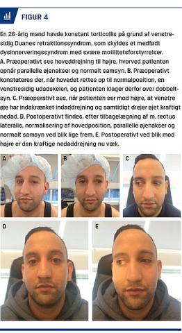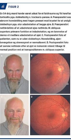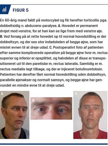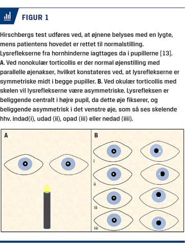 Torticollis er betegnelsen for en kompensatorisk abnorm hovedstilling, som kan være tegn på en underliggende årsag, som enten er okulær eller nonokulær [1-4]. Nonokulær torticollis kan være betinget af muskuloskeletale, neurologiske eller psykiatriske årsager [1-6]. Okulær torticollis (OT) er forårsaget af medfødt nystagmus eller medfødt/erhvervet skelen [7]. Den skelerelaterede OT ses efter hyppighed ved øjenmuskelpareser, okulære syndromer, mekaniske restriktioner og mest sjældent ved almindelige skeleformer [2, 7]. Den nystagmusrelaterede kompensatoriske hoveddrejning afhænger af, i hvilken blikretning patienten har mindst øjenuro, også kaldet nulpunktet [1]. Fælles for OT er en forstyrrelse i øjenbevægelsernes koordination med en kompensatorisk skæv hovedholdning for at undgå nystagmus eller skelen, som forårsager hhv. synsslør og dobbeltsyn ved blik lige frem [1, 4-6]. OT forekommer relativt sjældent, og blandt patienter med øjensymptomer er der fundet at være en forekomst på 1,1-5% [1, 8].