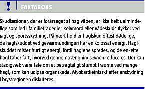 Personen i Figur 2 er derimod blevet skudt med et haglgevær, der anvendes til fuglejagt og lerdueskydning. Haglpatroner er ladet med adskillige hagl, sædvanligvis 80-300 med en samlet vægt på omkring 24-32 g og en hastighed på 350 meter pr. sekund ved geværmundingen. Diameteren af haglsværmen øges med afstanden, og hastigheden af de enkelte hagl reduceres markant efter ti meter (i modsætning til riffelprojektilet). Tæt på geværløbet er halgsværmens diameter få centimeter, og effekten er voldsom med betragtelig knusningsskade. På 25 meters afstand vil omkring 80% af haglene være lokaliseret inden for en cirkel af 75 cm. Hos den aktuelle patient var fordelingen af hagl, bedømt ud fra røntgenoptagelsen af thorax (A), formentlig opnået ved et skud på 10-15 meter, idet hovedparten af haglene er lokaliseret inden for en omkreds på 25 cm. Dette er klart inden for dødelig afstand, men andre grunde afbødede effekten. Sammenlignet med diameteren af left anterior descendent (LAD)-koronararterien (B) er hagldiameteren omkring to mm (små hagl i størrelse nr. 9), der sædvanligvis bruges til lerdueskydning og jagt på små fugle som vagtler og agerhøns. Figur 2 B og D, viser ingen deformering af haglene, hvilket gør det sandsynligt, at der er tale om stålhagl og ikke blyhagl, som deformeres og dermed afsætter mere energi. Energien af det enkelte hagl i størrelse nr. 9 er forholdsvis lav på 10-15 meters afstand, og evnen til kraftig penetration er derfor tilsvarende mindre.