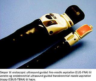 I forbindelse med stadieinddeling af patienter med lungekræft, er der i de senere år udviklet nye teknikker til at foretage ultralydvejledte biopsier af de mediastinale lymfeknuder. Det er i flere studier samstemmende påvist, at en kombination af ultralydvejledte henholdsvis endoskopiske transbronkiale og transøsofageale biopsiteknikker giver en sikker klassifikation af de mediastinale lymfeknuder. Denne metode er sammenlignelig med eller bedre end den konventionelle kombination af computertomografi og mediastinoskopi. Teknikkerne betegnes endobronchial ultrasound-guided transbronchial needle aspiration biopsy (EBUS-TBNA) og endoscopic ultrasound-guided fine-needle aspiration (EUS-FNA) [2]. EBUS-TBNA kan foretages i fuld eller lokal anæstesi. Bronkoskopet er foruden optik til videobilledet på spidsen forsynet med et ultralydhoved og en ballon, som kan fyldes med vand for at opnå bedre lydforhold. Det er således muligt ved hjælp af ultralydbilledet at finde og bioptere patologiske lymfeknuder paratrakealt og subkarinalt under hovedcarina samt bioptere tumorer, som vokser i disse områder. Nålens placering i det patologiske område monitoreres på ultralydbilledet. Med Doppler-teknik sikres det, at man ikke rammer kar. EUS-FNA foretages vanligvis i lokalanalgesi. Gastroskopet er på spidsen forsynet med videooptik og ultralydfaciliteter samt en biopsiåbning. Ved hjælp af ultralyd kan mediastinale strukturer som lymfeknuder, hjerte og kar identificeres. Med denne teknik nås mediastinale tumorer, paratrakeale og subkarinale lymfeknuder samt mere distalt beliggende lymfeknuder, som ikke kan nås ved EBUS-TBNA. Herudover kan venstre binyre nås.