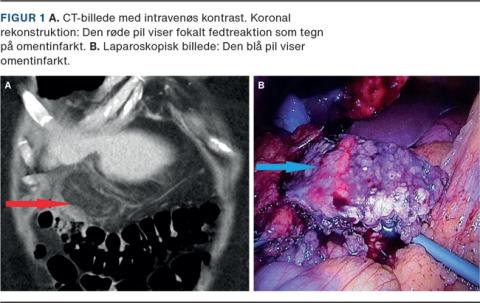 På mistanke om kolecystitis blev der foretaget UL-skanning af øvre abdomen, uden at man kunne påvise patologi, hvorfor der blev foretaget CT af abdomen med intravenøs kontrast i portovenøs fase otte timer efter UL-skanningen. I øvre højre kvadrant, i relation til ligamentum falciforme, fandt man et 6 x 3 cm stort fokalt område med fedtreaktion uden veldefineret hyperdens ring og med lidt fri væske omkring, hvilket er foreneligt med OI. Der var radiologisk mistanke om intern herniering af mesenterialt fedtvæv og torkvering pga. såkaldt whirl sign (Figur 1A). Patienten blev indlagt til observation.Pga. klinisk forværring og CT-verificeret omenttorkvering blev der foretaget laparaskopi. Peroperativt fandtes i ligamentum gastrocolicum mellem antrum og højre colon fleksur svært fortykket og hårdt nekrotisk oment, som blev fjernet laparoskopisk (Figur 1B).