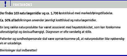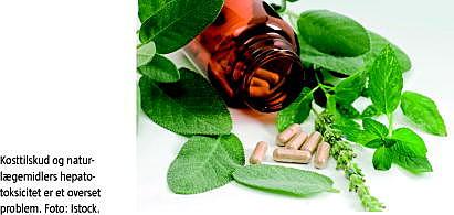 Naturlægemidler og kosttilskud har været anvendt i århundreder i visse kulturer, men de er et relativt nyt fænomen i den vestlige verden. Brugen er omfattende og tiltagende [1]. Et stigende antal tilfælde af alvorlige bivirkninger forbundet med indtagelse af naturlægemidler og/eller kosttilskud vækker bekymring [2]. Leveren, hvor hovedparten af lægemiddelnedbrydningen finder sted, er særlig udsat for at blive påvirket [3]. Blandt de iagttagede tilfælde er der rap-porteret om et bredt spektrum af kliniske manifestationer, der spænder fra asymptomatisk stigning af leverenzymer til akut hepatitis, ikterus og fulminant leversvigt [4]. Ligeledes er der rapporteret om tilfælde af kronisk leverskade i form af kronisk hepatitis med fibrose- og cirroseudvikling samt veno-okklusiv sygdom [2, 4].