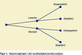 Beregningen af omkostningseffektivitet ved losartan over for apopleksi er baseret på en beslutningstræmodel med en gren for hver type behandling (Figur 1 ). Ved hver behandling vil patienten med en vis sandsynlighed få apopleksi, estimeret ud fra LIFE-undersøgelsens resultater, og dermed give anledning til en omkostning såvel som et tab i leveår og livskvalitet. Beregnes der et gennemsnit over omkostninger i hver arm, kan man derefter finde omkostningsforøgelsen ved brug af losartan frem for atenolol, som på den anden side skal sammenholdes med gevinsten enten i leveår eller i kvalitetsjusterede leveår (QALY). Ved at dividere den første med den sidste fås omkostningseffektivitetsbrøken, der fortæller, hvor meget der i gennemsnit betales for en QALY opnået ved at skifte fra atenolol til losartan.