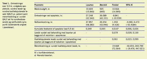 Der knytter sig ofte en betydelig usikkerhed til omkostningseffektivitetsanalyser. Det gælder også i dette tilfælde, hvor den helbredsmæssige gevinst, der opnås gennem reduktionen i antallet af apopleksitilfælde opgjort pr. patient er et ret lille tal. På grundlag af LIFE-studiets data er det muligt at estimere konfidensgrænser for omkostningseffektivitetsbrøken, således som vist i Tabel 1, hvor det ses, at nettoudgiften pr. vundet QALY ved anvendelse af losartan frem for atenolol lå inden for området 19.668-116.344 kr.; selv den øvre grænse er inden for det almindeligvis accepterede [14]. Eksempelvis er den øvre grænse for accept af omkostningseffektivitet baseret på omkostninger pr. QALY i Sverige 200.000-500.000 svenske kr. [13].