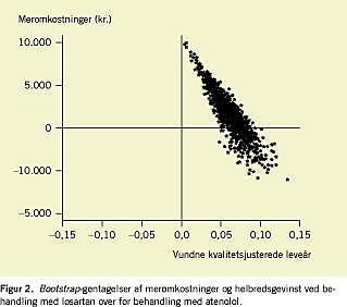 På grundlag af patientdata fra LIFE er det muligt at finde den empiriske fordeling af omkostningseffektivetetsbrøken ved bootstrapping [11-12], hvor der udtages et stort antal mindre delsampler af det samlede patientdatamateriale, for hvert af hvilke der udregnes gennemsnitlig omkostning og effekt; resultatet heraf, vist grafisk i Figur 2 , giver et billede af variabiliteten i det samlede materiale hentet fra LIFE-undersøgelsen. Når det som her ligger nogenlunde samlet, betyder det, at gennemsnittet er rimeligt dækkende for det samlede patientdatamateriale. Det bemærkes, at for mange delsampler er der tale om både omkostningsbesparelse og helbredsgevinst.