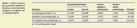 Den anden form for usikkerhed, som refererer til metode og skøn over omkostninger ved apopleksibehandling, kan belyses ved at gennemføre beregninger med alternative udgangsskøn for de relevante størrelser. I Tabel 2 vises virkningen af ændrede antagelser om omkostningerne ved apopleksi.