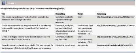 Interessant nok har man i et dansk studie undersøgt effekten af erlotinib tillagt bevacizumab, altså en kombination af VEGF- og EGFR-hæmning, ved forskellige øvre gastrointestinale cancere. Samlet set havde behandlingen lille effekt, men der blev observeret respons hos enkelte patienter med galdegangscancer [22]. Udvalgte patienter i god almentilstand kan få denne behandling som en sidste udvej, og i et lille retrospektivt studie har man da også fundet en responsrate på 15%, ligesom 31% havde sygdomsstabilisering over 6 mdr. [23]. En prospektiv protokol følger op på resultaterne med indsamling af tumorvæv og plasma til markøranalyser (Tabel 1).