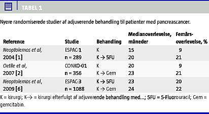 Trods fremskridt i den ikkekirurgiske behandling af patienter med pancreascancer (PC) er den eneste kurative mulighed fortsat radikal operation. Resektabel sygdom findes hos ca. 20% af de vurderede patienter. I multicenterstudier er den mediane overlevelse efter radikal resektion 18-24 måneder, men kun omkring 10% er i live efter fem år. Derfor er effekten af supplerende behandling undersøgt i en række større studier (Tabel 1 ).