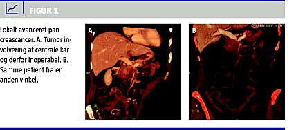 Omkring en tredjedel af alle patienter debuterer med lokalt avanceret pancreascancer (LAPC) (Figur 1 ), hvor det ikke er muligt at foretage radikal resektion, hyppigst på baggrund af indvækst i de centrale kar. Ubehandlet er den mediane overlevelse for disse patienter kun seks måneder [8]. Det er ikke afklaret, om standardbehandlingen bør være kemoterapi eller radiokemoterapi eller måske en kombination.