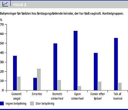Også kontrolgruppen blev spurgt om bekymringer i forbindelse med deres første vaginale fødsel, der blev specificeret som for casekvinderne. Fordelingen adskilte sig markant fra casegruppen (Figur 2 ). Det udsagn, som flest kvinder, 23%, var helt enige i, var bekymring for smerter under fødslen, og 15% var generelt angste for at føde vaginalt. Den største forskel var i bekymringen for egen sikkerhed, hvor 33,5% af cases mod kun 4,5% af de vaginalt fødende havde denne bekymring (Tabel 2).