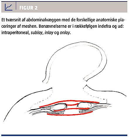 Incisionelle ventralhernier skal opereres med indsættelse af kunststofmesh, såfremt operationsfeltet ikke er kontamineret [5]. Meshen kan placeres anteriort for musculus rectus abdominis og linea alba (onlay), mellem de mediale kanter af musculus rectus abdominis (inlay), profund for musculus rectus abdominis, men anteriort for peritoneum (sublay) eller profund for peritoneum (intraperitoneal) (Figur 2).