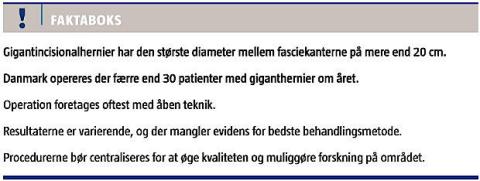 Operation for incisionalhernie gennemføres i Danmark ca. 1.500 gange om året [1]. Den operationstekniske behandling er præget af ringe evidens [2]. Giganthernier udgør en særlig gruppe, hvor den største tværgående afstand mellem fasciekanterne i brokporten er mere end 20 cm. I Danmark opereres der færre end 30 patienter med giganthernier om året (Figur 1). Prævalensen af giganthernier er ukendt.