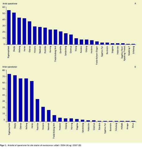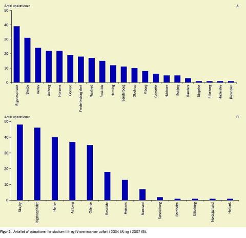 Resultater: I alt 1.909 kvinder blev opereret for cancer ovarii, med uændret antal pr. år over de fire år, perioden dækker. Operationerne foregik på 47 afdelinger fordelt på 29 hospitaler, mens stadium III-IV-kræfttilfældene blev opereret på 31 afdelinger. Sidstnævnte operationer var faldende i perioden til otte afdelinger i 2007 og yderligere reduktion til seks afdelinger er planlagt i 2008. Tredivedages mortaliteten var 3,9% og lå stabilt i perioden.