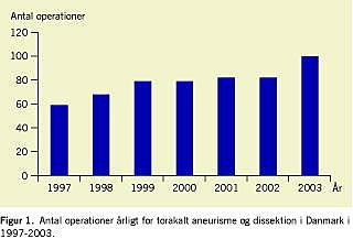 Materiale og metoder: Undersøgelsen er baseret på udtræk fra Landspatientregisteret i perioden 1997-2003 for patienter med operationskoderne fra FCA00 til og med FCW96 (omfatter alle typer operationer på aorta thoracalis) i kombination med diagnosekoderne fra DI71.0 til og med DI71.9 (alle typer aneurismer og dissektioner på aorta thoracalis). Operationsbeskrivelser og epikriser for alle patienter samt epikriser fra alle overflytninger/genindlæggelser postoperativt blev gennemgået. Postoperativ liggetid og mortalitet blev registreret.
