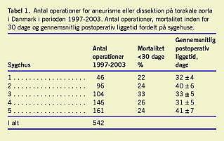 Resultater: Opgørelsen omfatter 542 patienter med en gennemsnitsalder på 59 år ± 12 år, hvoraf 366 (68%) blev opereret akut. I alt 369 patienter blev opereret for aortadissektion, og 173 blev opereret for aneurisme. Antallet af operationer steg i perioden fra 59 årligt i 1997 til 100 årligt i 2003. Mortaliteten inden for 30 dage var 18% for aneurismer og 30% for dissektioner. Den gennemsnitlige postoperative liggetid var 35 ± 12 døgn. Der var ingen forskel i mortalitet eller postoperativ liggetid ved sammenligning af de forskellige sygehuse. I alt 345 patienter (64%) fik en eller flere alvorlige postoperative komplikationer. Svære neurologiske komplikationer forekom hos 20% af de patienter, der var opereret for dissektion, og hos 10% af de patienter, der var opereret for aneurisme. Reoperation for blødning forekom hos 19% af de patienter, der var opereret for dissektion, og hos 10% af de patienter, der var opereret for aneurisme. Organisatorisk blev alle operationer foretaget på de fem hjertecentre i Danmark i overensstemmelse med Sundhedsstyrelsens retningslinjer. Imidlertid viste opgørelsen, at hele 49 operatører foretog de 542 indgreb. Dette svarer til gennemsnitligt 1,7 operation pr. kirurg pr. år.