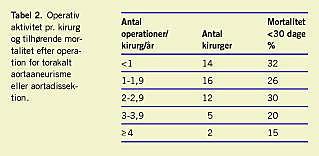 Undersøgelsen har vist, at operation for aneurisme og dissektion i torakale aorta udelukkende udføres på de thoraxkirurgiske afdelinger i Danmark. Antallet af operationer er imidlertid meget ulige fordelt med en faktor 3-4 i forskel mellem afdelingerne med laveste og højeste aktivitet, og antallet varierer fra i gennemsnit syv operationer pr . år til 24 pr. år. Der var dog ingen forskel i mortalitet afdelingerne imellem. Imidlertid viste det sig, at 49 kirurger havde udført de i alt 542 operationer med meget forskellig operationsaktivitet pr. år. Således udførte 42 kirurger 1-3 operationer pr. år, og fem kirurger udførte 3-18 operationer pr. år. Mens den førstnævnte gruppe havde en næsten ens mortalitet på ca. 30%, var mortaliteten næsten det halve, ca. 15%, i den sidstnævnte gruppe. Årsagen til denne forskel har det ikke været muligt at afklare i denne undersøgelse. Man kunne antage, at de bedre resultater for kirurger, der udfører mere end fire operationer om året, skyldes en større erfaring med netop denne type teknisk vanskelige operationer. I udenlandske opgørelser fra de senere år har man påvist, at mange teknisk komplicerede operationer er behæftet med højere mortalitet og komplikationsrater, hvis indgrebet udføres på sygehuse med lavt volumen af tilsvarende lavvolumenkirurger [11, 12]. Dette har også været tilfældet inden for den kardiovaskulære kirurgi. Det gælder for procedurer, som aortaklapudskiftning, koronar bypasskirurgi og resektion af abdominalt aortaaneurisme [3, 12]. I disse undersøgelser er det påpeget, at ikke kun den kirurgiske teknik er vigtig, men også udvælgelsesprocedure, anæstesi og intensiv terapi er vigtige elementer i en samlet indsats for at nedbringe mortalitet og morbiditet.