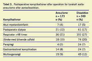 I alt 345 patienter (64%) fik en eller flere alvorlige postoperative komplikationer. Generelt var forekomsten af komplikationer højere ved dissektioner end ved aneurismer og højere for operationer udført akut frem for operationer udført elektivt. Reoperation for blødning forekom hos 10% af de patienter, der var opereret for aneurisme, og hos 19% af de patienter, der var opereret for dissektion. Blandt de kardiale komplikationer forekom hjertepumpesvigt hos 8,7% opereret for aneurisme og hos 14% opereret for dissektion. Af øvrige komplikationer forekom svære neurologiske komplikationer med blivende funktionsnedsættelse hos 20% af de patienter, der var opereret for dissektion, mens dette kun forekom hos 10% af de patienter, der var opereret for aneurisme (Tabel 3 ).
