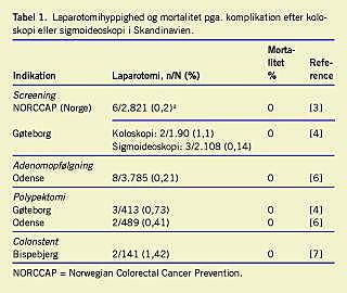 Hyppigheden af perforation angives i nyere større skandinaviske kliniske serier og screeningsmaterialer til at være under 1% [2-6] (Tabel 1 ). Hyppigheden er højere ved terapeutiske end ved diagnostiske procedurer [3, 5, 6].