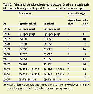 Det højeste antal anmeldelser årligt var 22 i 2002, hvor der blev foretaget 57.330 kolo- og sigmoideoskopier på 48 afdelinger i Danmark (Tabel 1). Det år var hyppighederne af anmeldte laparotomikrævende læsioner således 1:1.607 (0,06%) ved koloskopi og 1:12.597 (0,008%) ved sigmoideoskopi, hvis man antager, at stort set alle disse alvorlige forløb senest to år senere er kommet til Patientforsikringens kendskab. Der var på undersøgelsestidspunktet ikke anmeldt skader opstået under endoskopi udført som led i screeningprojekter.