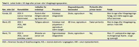 Tre patienter døde inden for 30 dage efter operation for læsionen (en patient med cancer prostatae, kronisk obstruktiv lungesygdom og uræmi) eller tilbagelægningsoperation (en med diffus karcinose, og en, der havde fækal peritonitis og fik akut myokardieinfarkt to døgn postoperativt). Mortaliteten blandt 77 patienter med perforation i den amerikanske Medicare -database var på samme niveau som mortaliteten i denne undersøgelse (5%) [9].