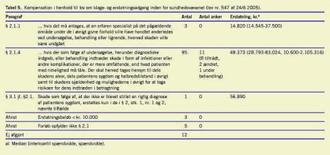Som det fremgår af Tabel 5 blev langt de fleste patienter med anerkendte skader tilkendt erstatning efter det såkaldte rimelighedskriterium (lovens § 2.1.4), mens 7% ikke kunnet tildeles erstatning. Variationen i beløbene skyldes forskellene i forløbene mht. indlæggelsesvarighed, mengrad, erhvervsevnetab samt svie og smerte. Det højeste erstatningsbeløb blev tilkendt en 44-årig kvinde, der blev ramt af apopleksi postoperativt med et erhvervsevnetab på 65% til følge. I alt fem patienter led et varigt erhvervsevnetab (på mediant 30%, spændvidde: 15-65%).