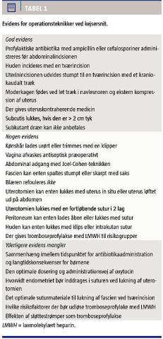 Kejsersnit er et hyppigt foretaget kirurgisk indgreb, og patientgruppen er ung, hvorfor det er yderst relevant, at de anvendte operationsteknikker er evidensbaserede. Der mangler fortsat evidens for flere delprocedurer ved kejsersnit (Tabel 1). Der er især behov for studier af langtidskonsekvenserne af de forskellige teknikker; men der er øget opmærksomhed på dette, og flere studier er undervejs.