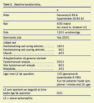 Såvel inkluderede som ekskluderede patienter blev registreret. Af de 80 primært identificerede albuer opfyldte 80 inklusionskriterierne. Heraf blev 49 efterfølgende ekskluderet, og årsagerne hertil fremgår af Tabel 1 . Tilbage var 31 albuer (30 patienter). Tabel 2 viser »baseline- karakteristika« for disse patienter.